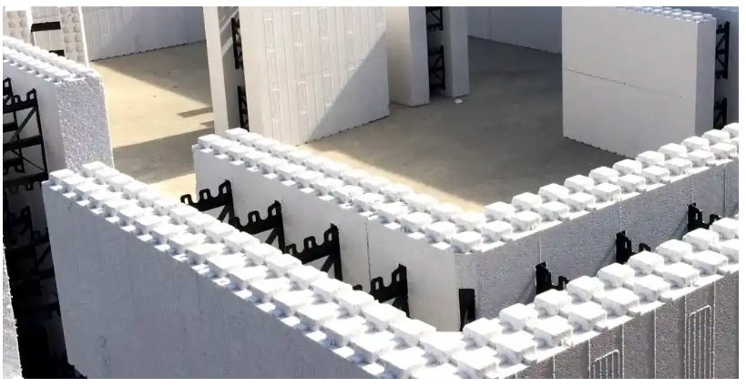 Insulated concrete form (ICF) is an innovative system of expanded polystyrene (EPS) rigid insulation blocks separated by plastic webbing. It is used as an integrated concrete form to pour a concrete wall instead of a traditional wood plank or plywood form. ICF blocks come in interlocking sections, so a wall system fits tightly together. Once the blocks are in place, concrete is poured, and finishes like drywall and siding are attached to fastener strips embedded in the insulation.